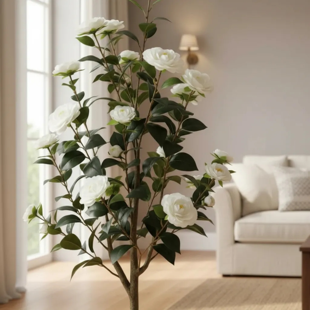 Gracias a su altura de 120 cm, esta camelia artificial se destaca como pieza decorativa principal en livings, oficinas, locales comerciales, recepciones o espacios interiores amplios. Es ideal para quienes desean una solución práctica y elegante, sin riego, sin luz especial y sin cuidados constantes.
