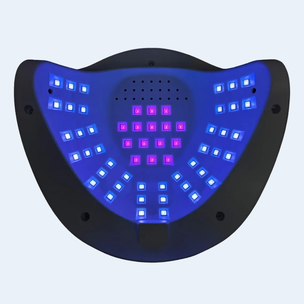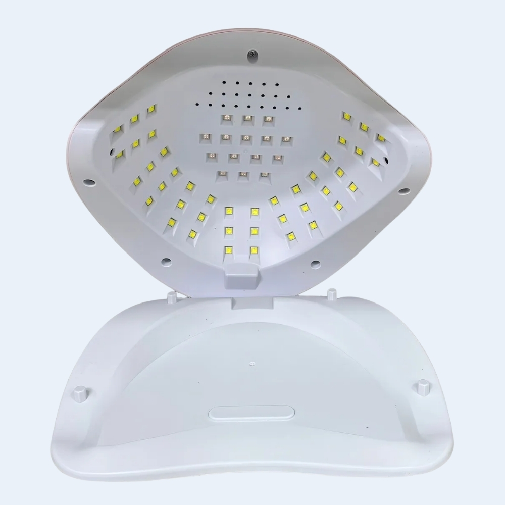 Gracias a su potencia de 268W y a sus 57 lámparas LED distribuidas estratégicamente en el interior, garantiza una cobertura completa, evitando puntos ciegos y logrando un secado uniforme en todas las uñas al mismo tiempo. Su longitud de onda dual de 365 + 405 nm permite un curado rápido y seguro, sin dañar la piel ni provocar oscurecimiento en las manos.