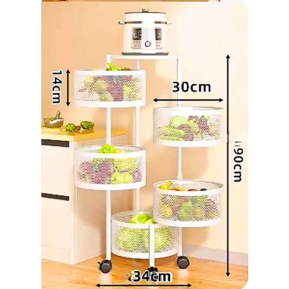 +Diseño Multifuncional: Con cinco niveles de canastas metálicas espaciosas, este estante es perfecto para almacenar frutas, verduras, utensilios de cocina, productos de limpieza, artículos de baño, y mucho más.